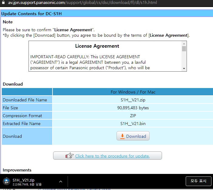 S1H 펌웨어 업데이트 사이트 링크 : https://av.jpn.support.panasonic.com/support/global/cs/dsc/download/index4.html
