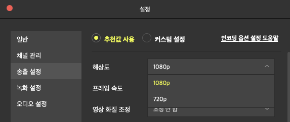 송출 해상도 설정은 1920x1080 혹은 1280x720 두가지입니다. 프레임레이트는 30p와 60p 둘 중에 선택할 수 있습니다. 송출되는 화면에 대해 녹화도 가능합니다.