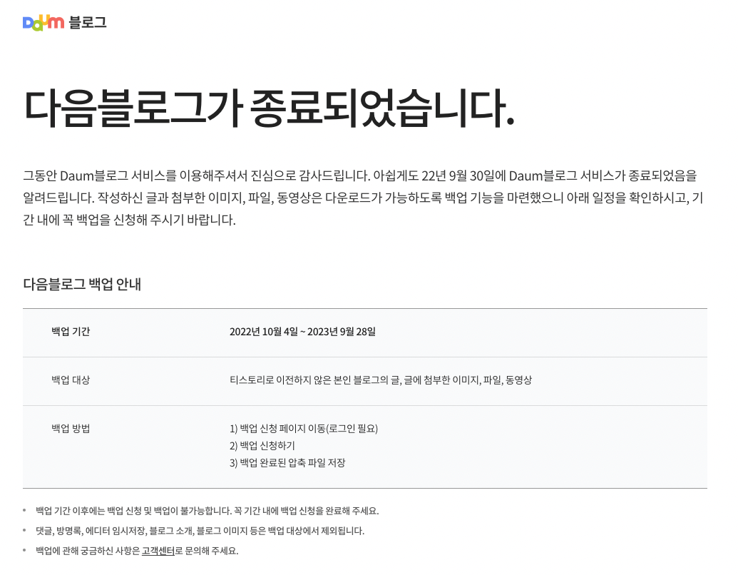 카카오와 합병 후 어정쩡하게 서비스들을 유지하던 다음. 아주 간만에 한메일에 들어가봤더니 다음이 블로그 서비스를 종료한다는 메일이 들어와 있었다. 그것도 9월 30일에 이미 서비스는 종료 되었더라. 백업 신청 기간은 내년 9월까지로 해두긴 했다만 뭔가 급작스레 통보받은 느낌이라 살짝 당황하기도 했다.